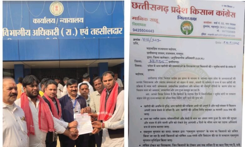 छत्तीसगढ़ में धान खरीदी का संकट: किसान कांग्रेस का उग्र आंदोलन, SDM दफ्तर घेरा, राज्यपाल को 7 मांगों का अल्टीमेटम